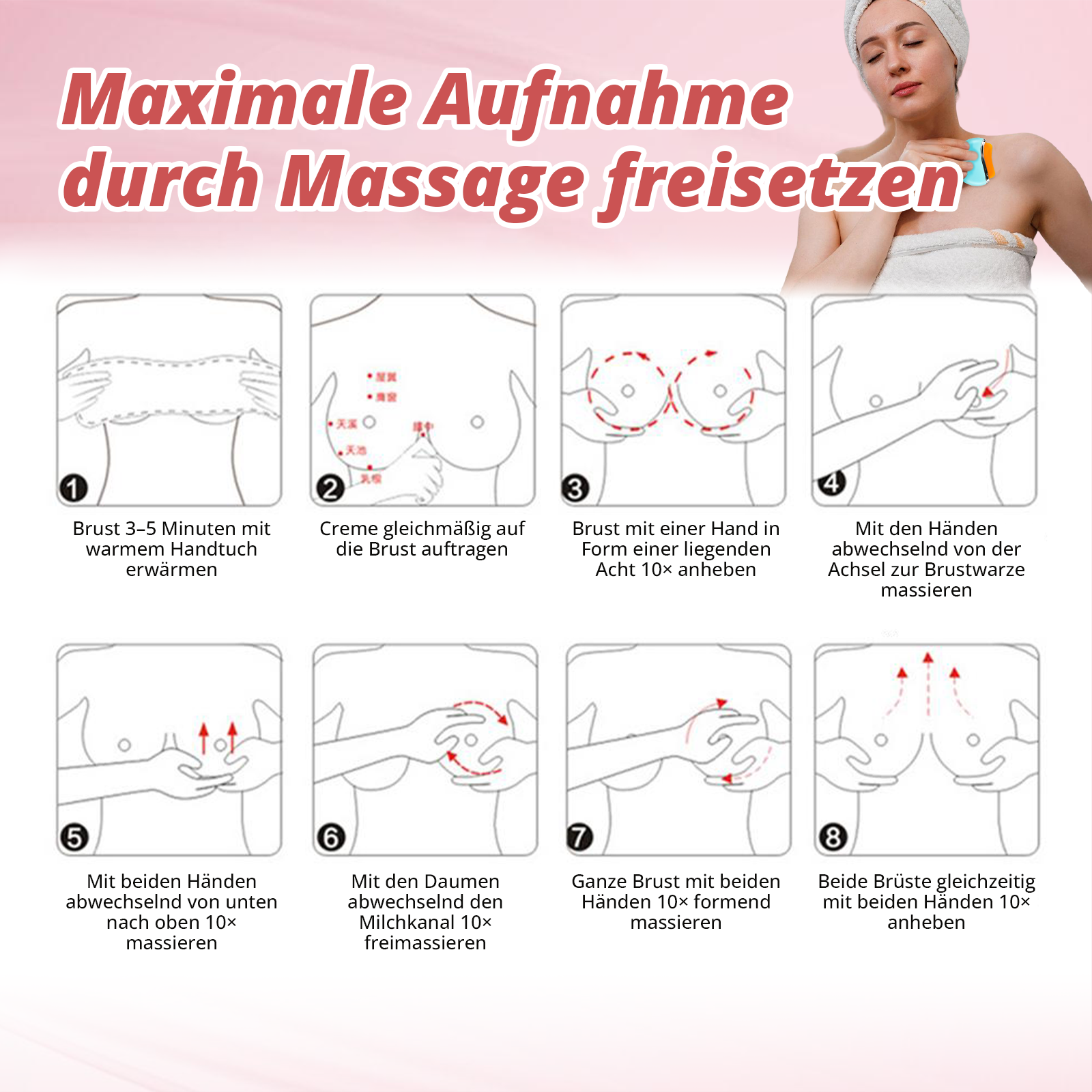 Die natürlichen Inhaltsstoffe des Dobshow®-Öls (wie Fenchel und Kudzu-Wurzelextrakt) müssen massiert werden, um tief in das Unterhautgewebe einzudringen, die Fettzellen rund um die Brustdrüsen zu stimulieren und die Kollagensynthese zu fördern. Massage verbessert die Durchblutung und ermöglicht eine effizientere Aufnahme der Wirkstoffe – entscheidend für die Aktivierung der Fettspeicherung und die Verbesserung der Gewebeelastizität , die Grundlage einer natürlichen Brustvergrößerung.