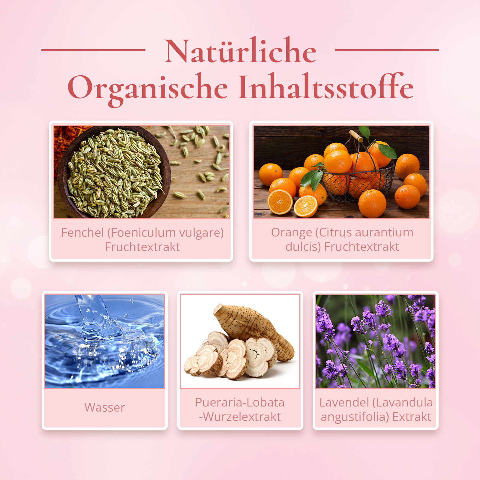 Das Öl kombiniert phytoöstrogenreiche Pflanzenstoffe (wie Fenchel und Kudzu-Wurzel) mit kollagenfördernden Inhaltsstoffen , um: